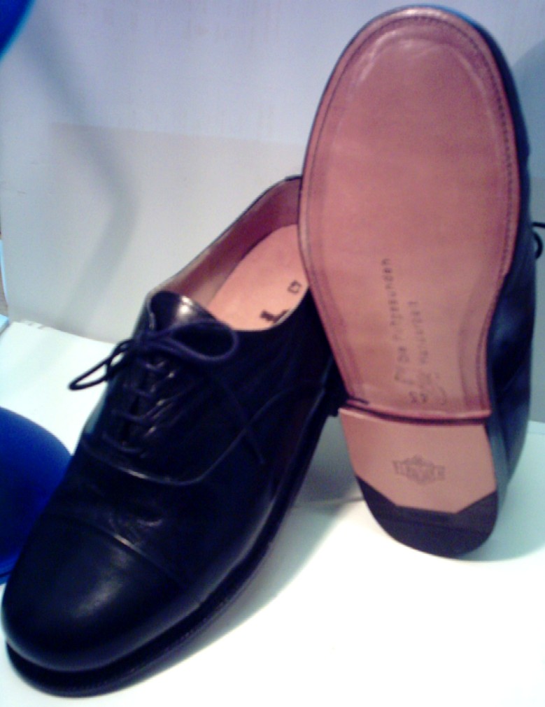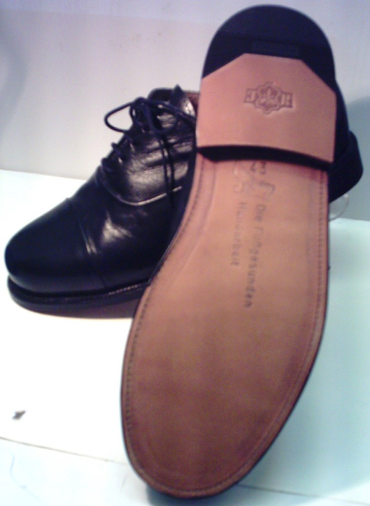 Das Modell Exclusiv zeichnet sich durch seine Rahmengenähte Machart Blake-Rapid aus : Der Rahmen wird mit dem Oberleder, Futterleder und der Lederbrandsohle durch eine stabile Naht verbunden. Der enstehende Hohlraum wird mit Kork ausgefüllt und anschließend die grubengegerbte Laufsohle mit einer unlösbaren Naht an den Rahmen angenäht . Auch der Absatz ist aus Leder mit einer Gummiecke versehen, damit der Auftrittsstoß gedämpft und der Abrieb gemindert wird.