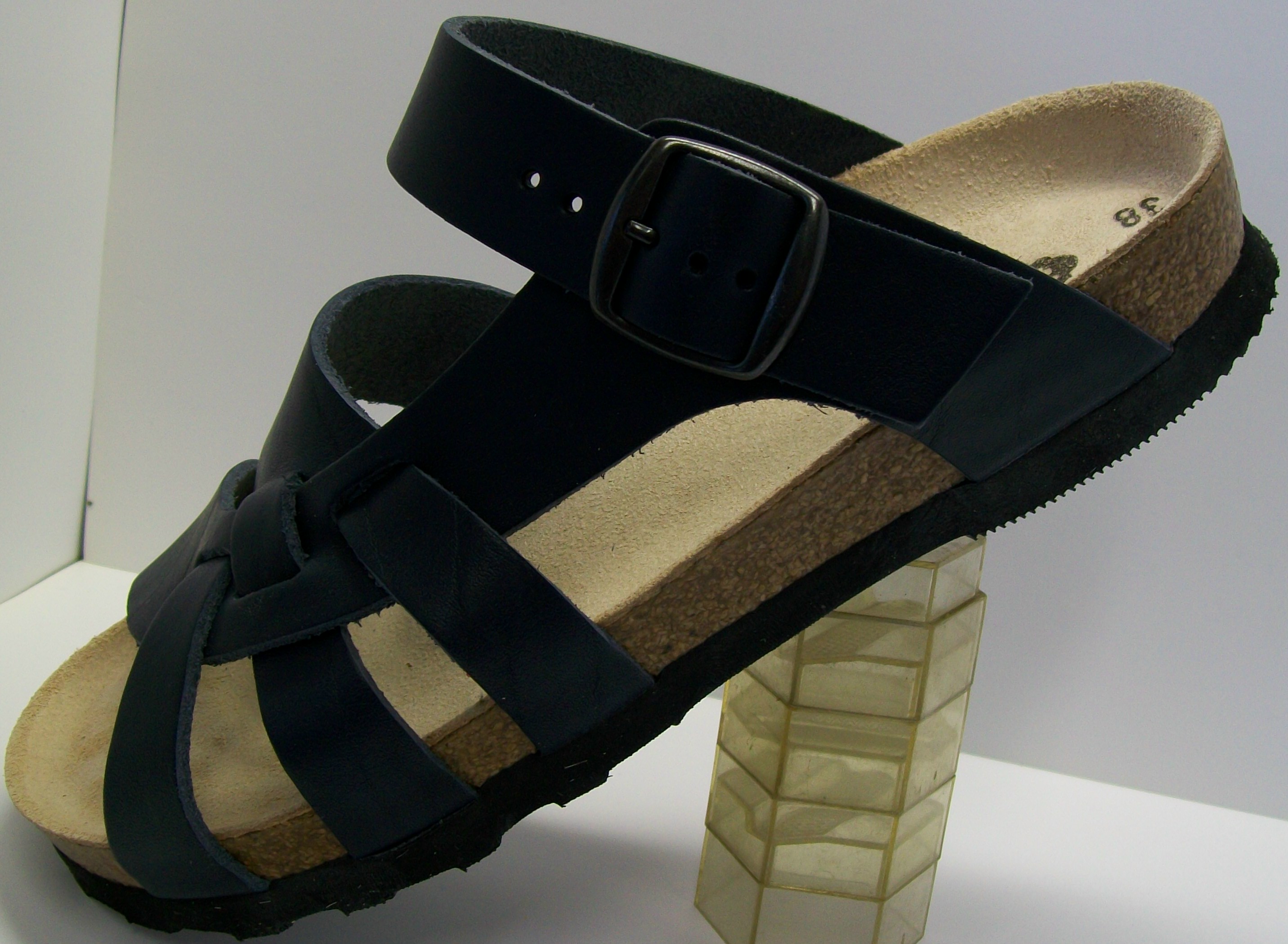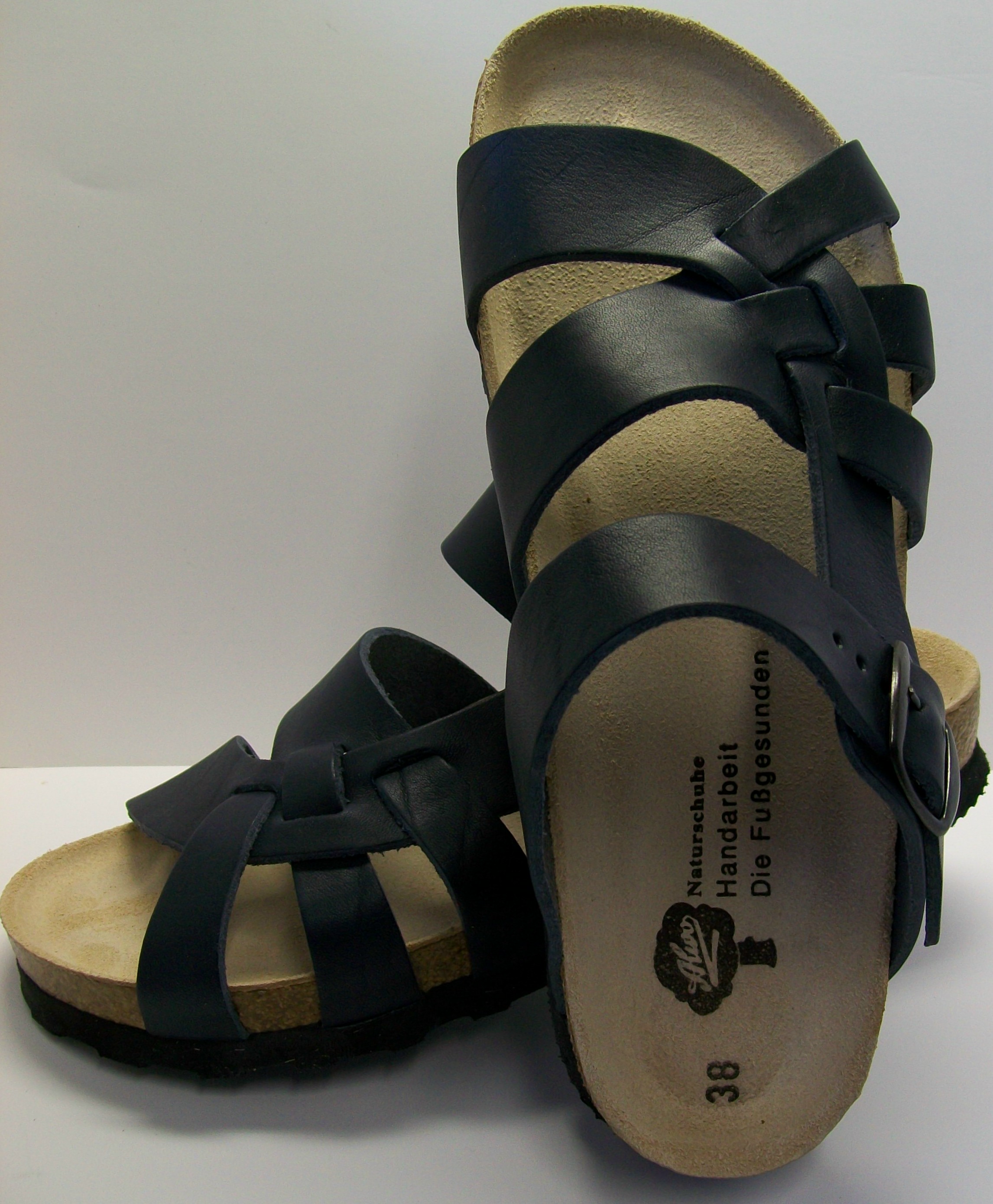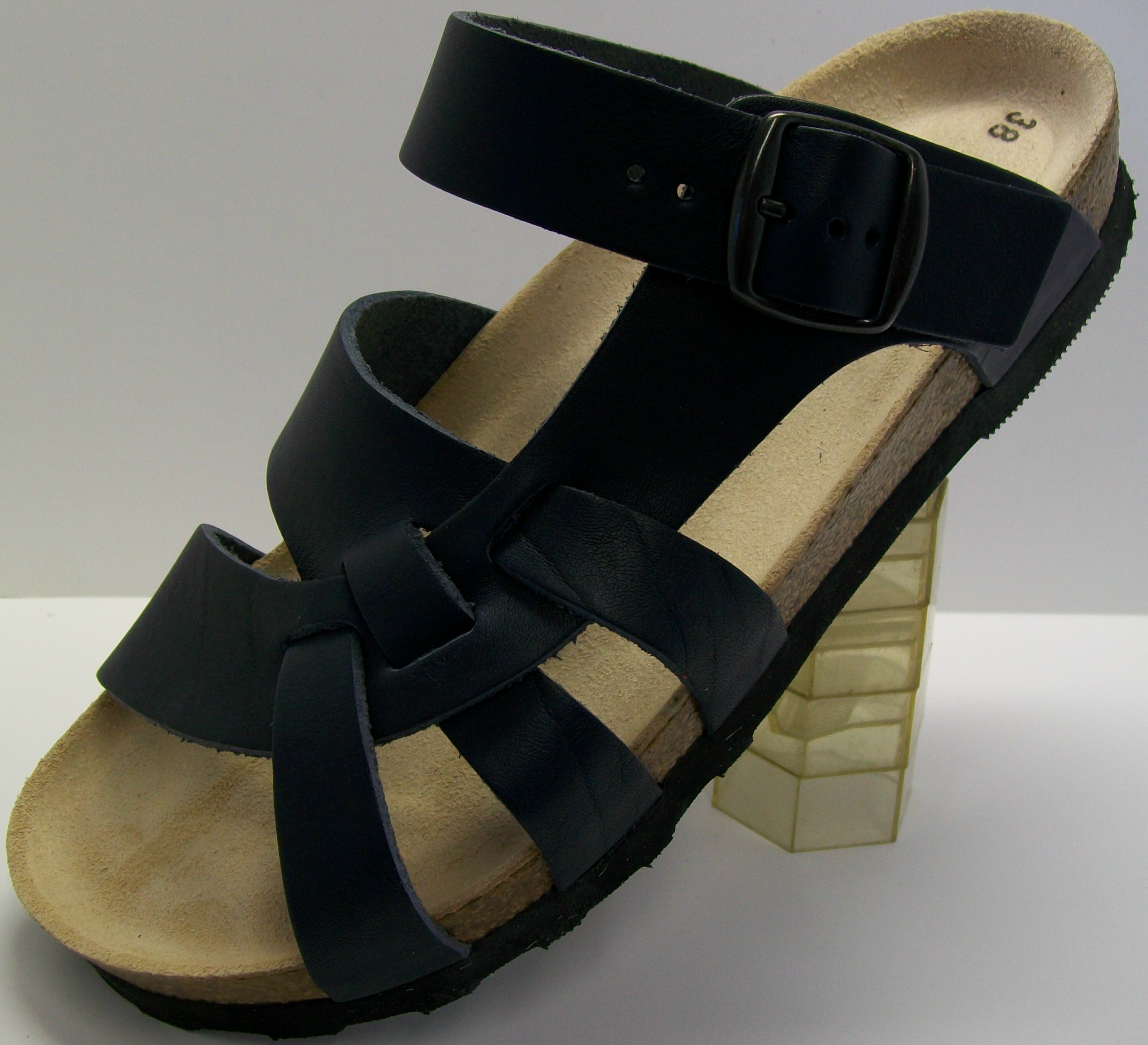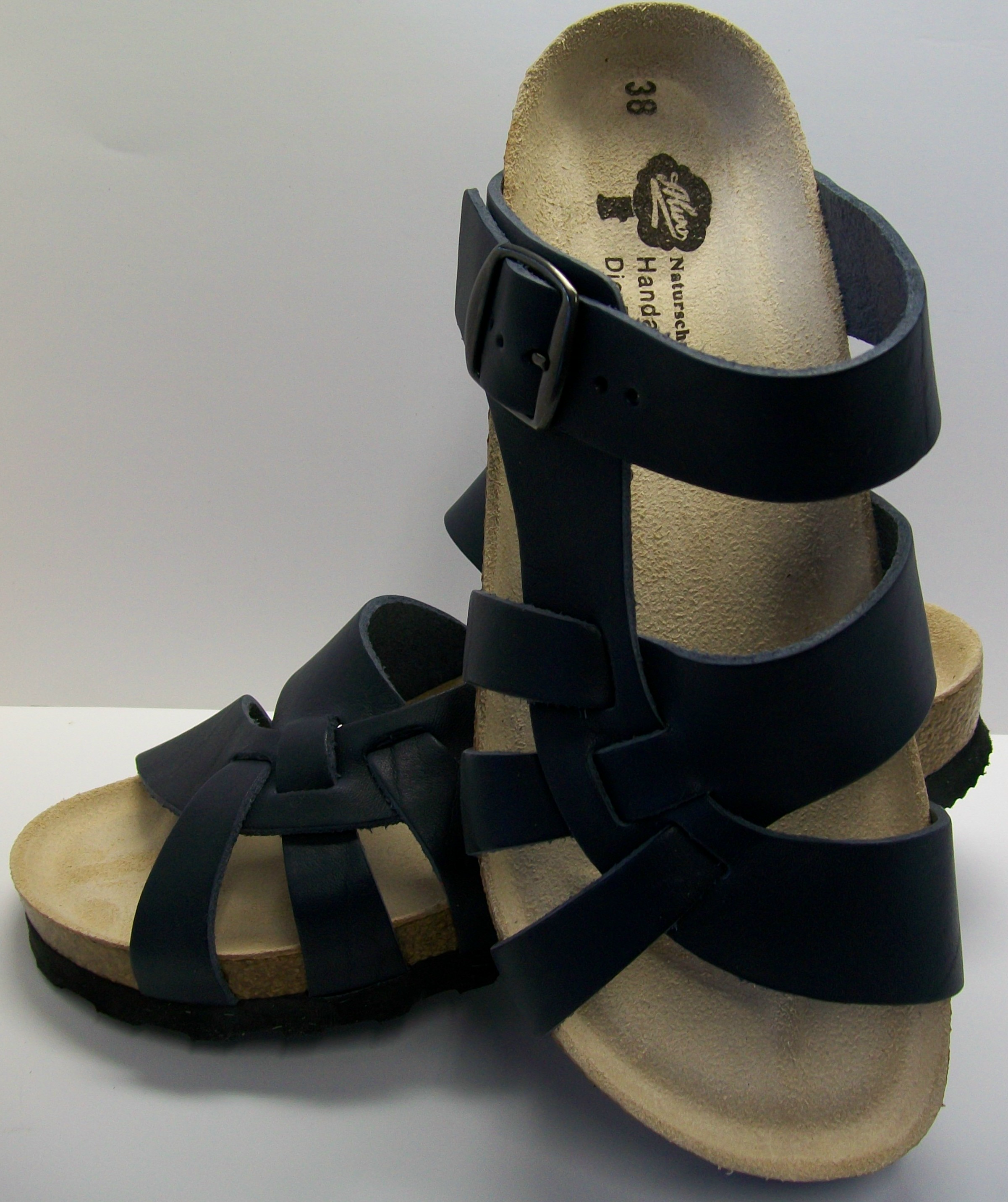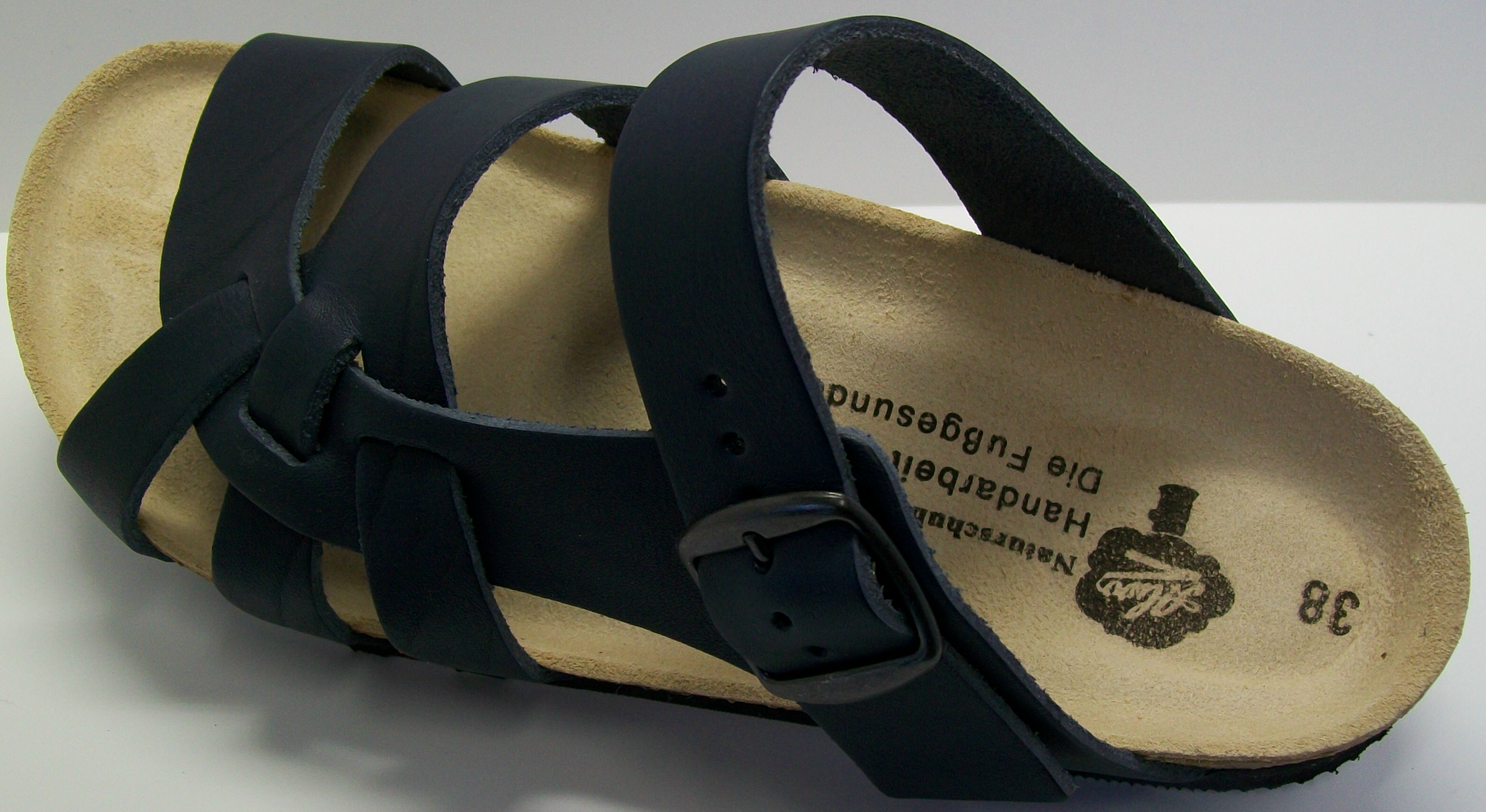 Dieser Damen-Tieffußbettslipper in dunkelblauem Rindleder, mit einer etwas anderen Schaftgestaltung, gibt dem Fuß einen sehr guten Halt.